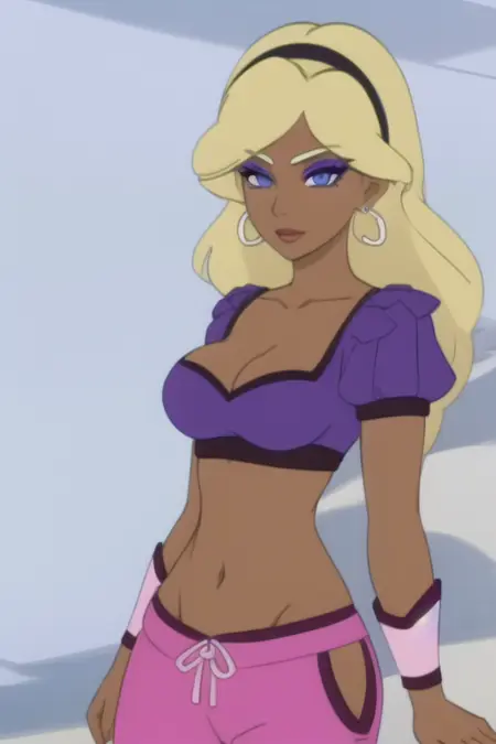 FatimaAl4ddin, 1girl, solo, blonde hair, dark skin, dark-skinned female, midriff, navel, cleavage, pants, blue eyes, crop top, medium breasts, purple pants, hairband, long hair, earrings, jewelry, eyeshadow