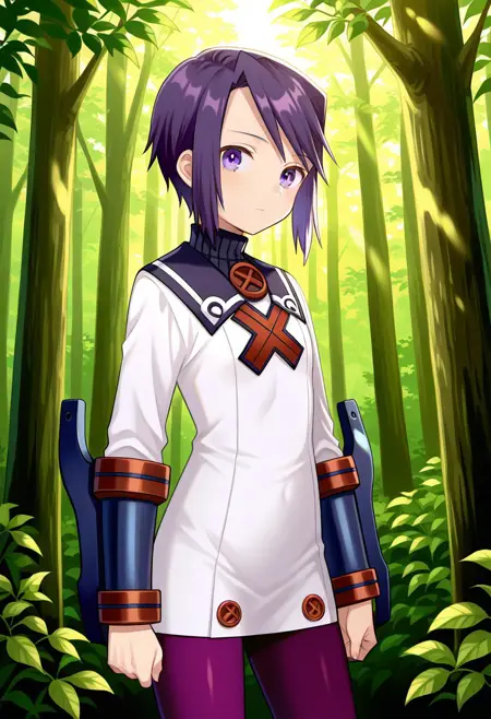 提示词:toris_SN2,紫色头发,短发,刘海,侧发,短发配长发束,高领,水手领,白色连衣裙,短裙,长袖,护臂,连裤袜,紫色连裤袜,踝靴负面提示:Settei,单色,线稿