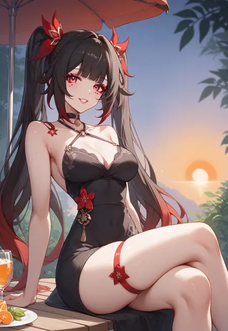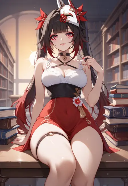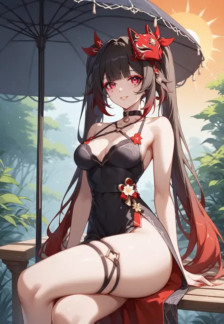 추가 트리거 단어: 더블 테일, 머리끈, 어깨 드리워진 키모노, 머리에 마스크, 분리된 소매, 초커, 오비, 한쪽 장갑, 십자 끈 샌들, 손목밴드, 십자 하프터, 허벅지 스트랩, 검은 머리, 그라데이션 머리, 다채로운 머리