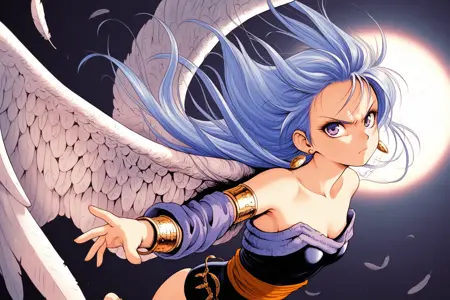 1girl, female focus, long hair, blue hair, earrings, anklet, purple off-shoulder top, gold bracelets, armlets, detached sleeves, black leotard, sash, feathered wings, angel wings, transparent harem pants, purple pantyhose, black shoes
