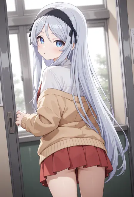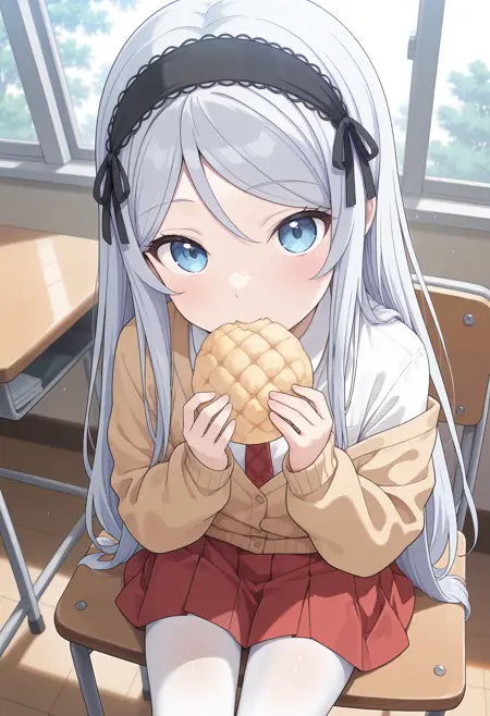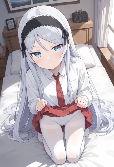 默认:蓝色眼睛,银色头发,非常长的头发,黑色发带