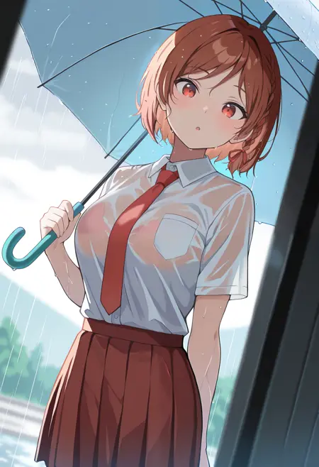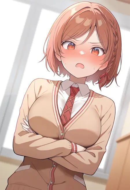 옷차림: 학생복, 흰 셔츠, 빨간 넥타이, 카디건, 긴 소매, 주름치마, 팬티스타킹, 로퍼