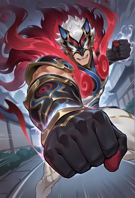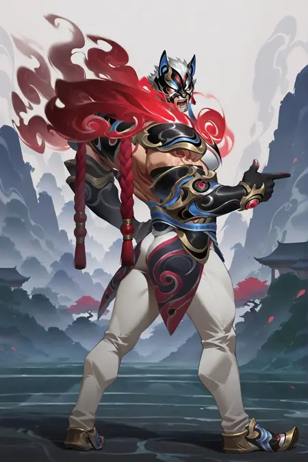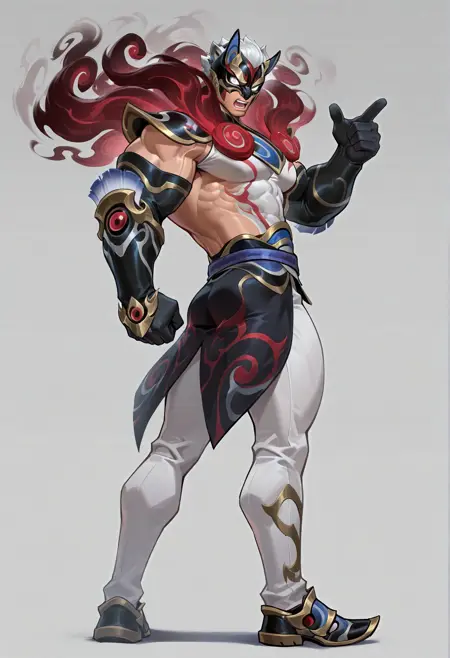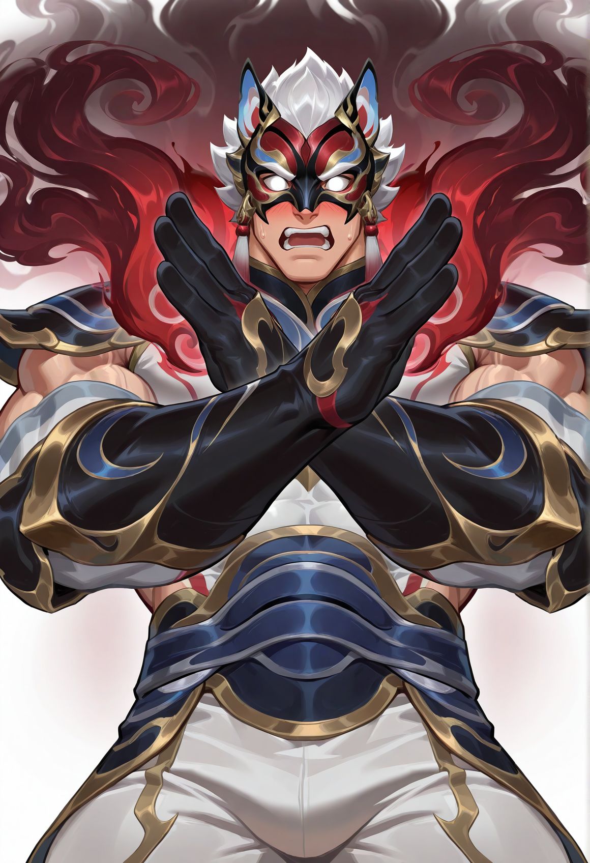 red-sett,mask,white eyes,no pupils,white hair,white pants,black/red steam shoulder armor,gloves,