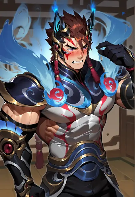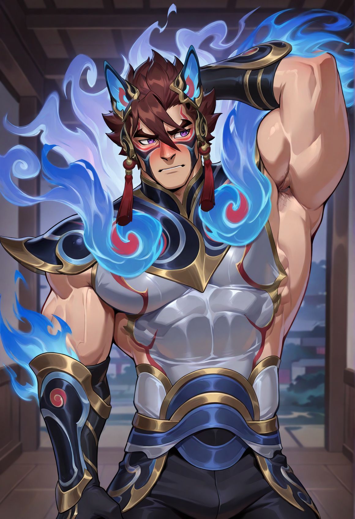blue-sett,facepaint,purple eyes,reddish-brown hair,black pants,blue/indigo steam shoulder armor,gloves,