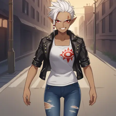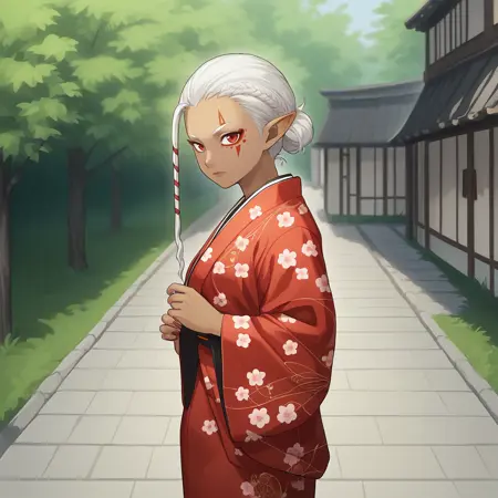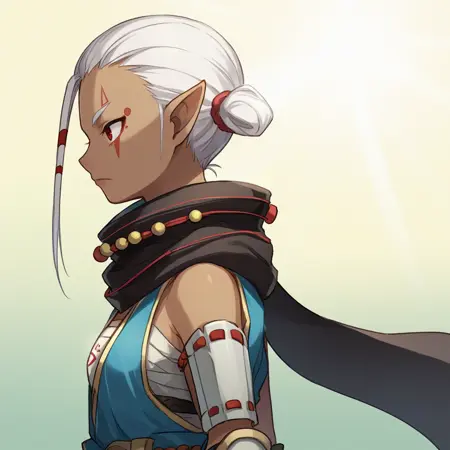 선택 사항: 단발, 검은 피부, 검은 피부를 가진 여자, 빨간 눈, 하얀 머리, 뾰족한 귀, 얼굴 문신, 스카프, 파란색 일본 갑옷, 모래신, 종아리 보호대, 팔 보호대
