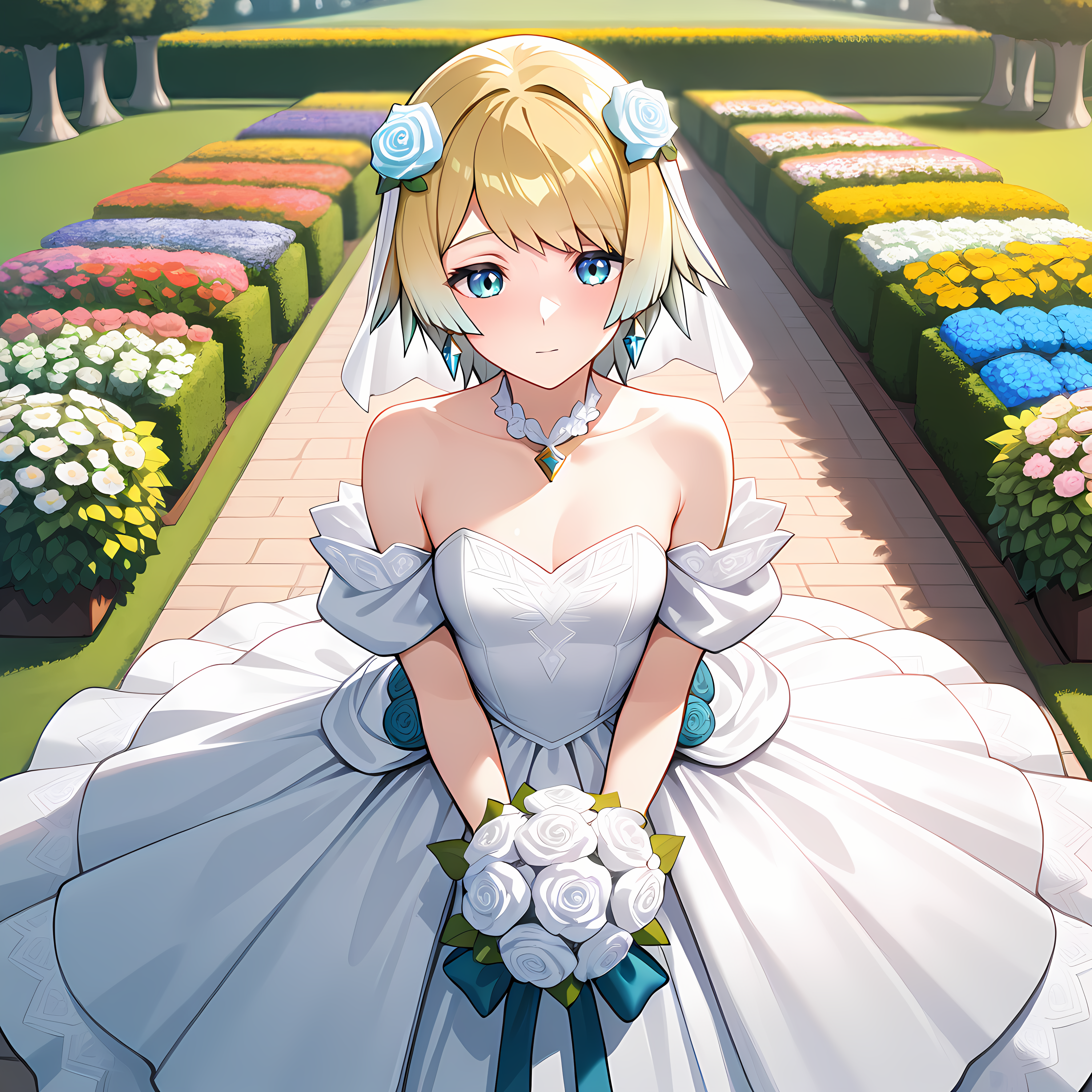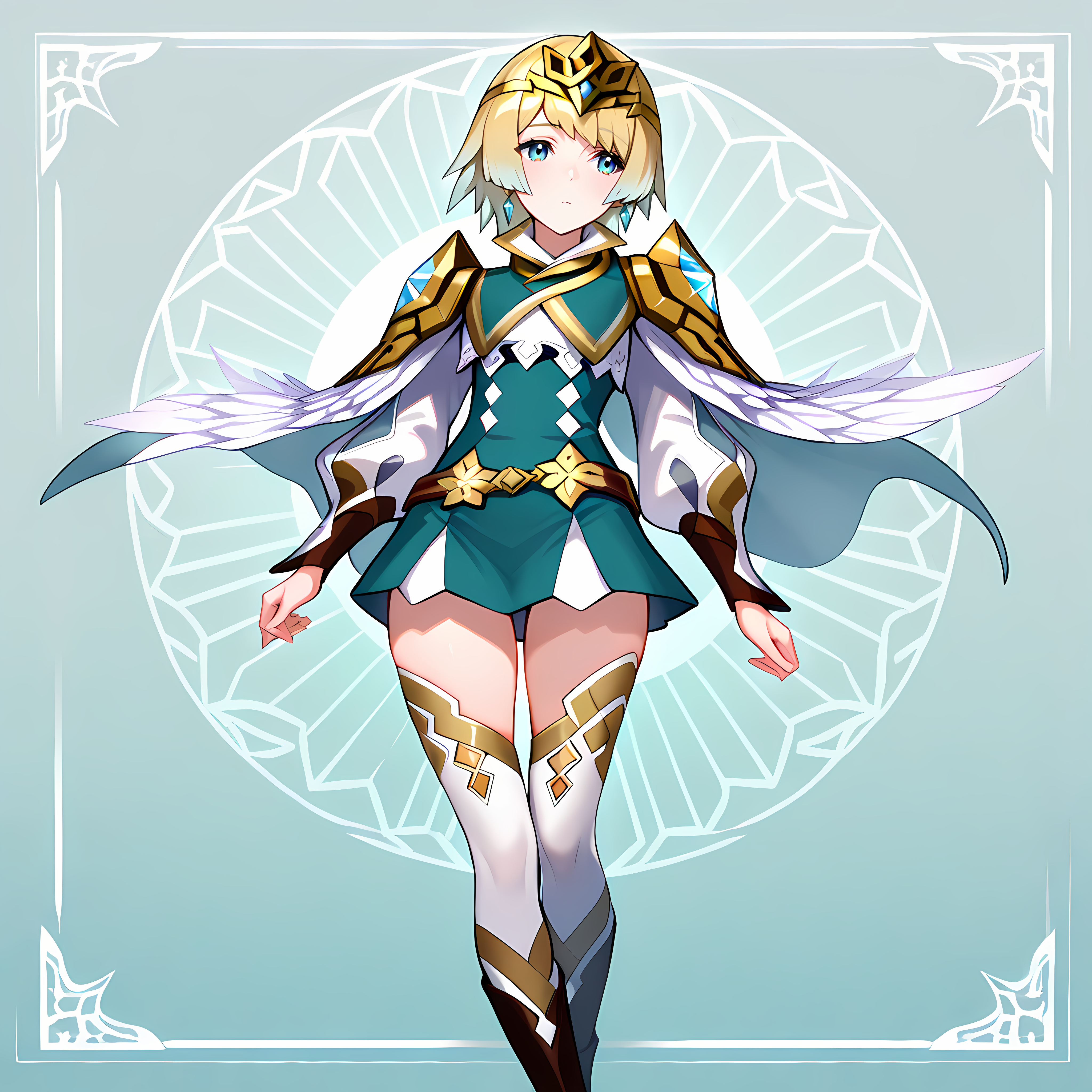オプション:グラデーションヘア、マルチカラーの髪、短髪、金髪、前髪、青い目、羽のトリム、肩甲板、長袖、ブーツ、マント、太ももまでの靴下、短いドレス、絶対領域、ティアラ、ジュエリー