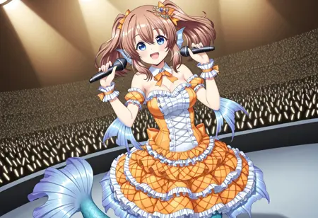 Main outfit: dress, frilled dress, orange dress, hair ornament, ribbon, frills, wrist cuffs