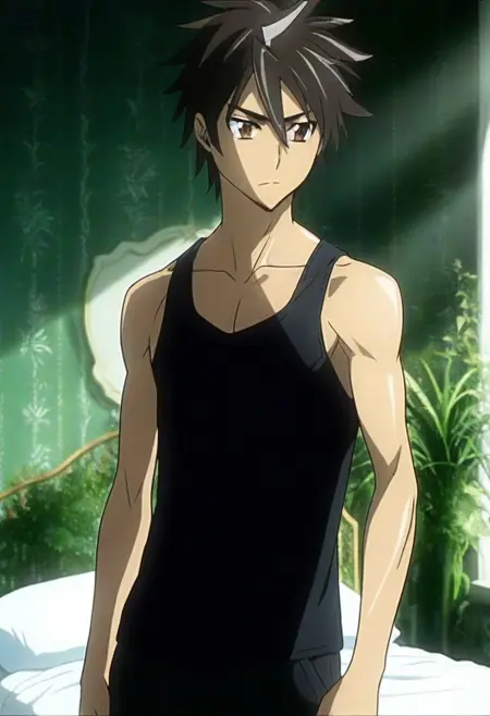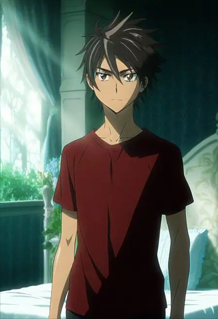 Takashi Komuro, black-brown hair, brown eyes, black gakuran uniform, open gakuran, red t-shirt, black pants
