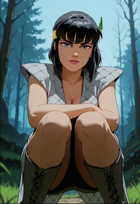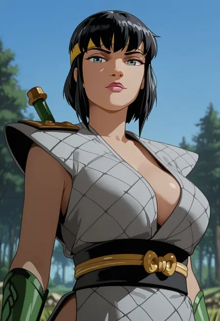 (japanese_clothes, cape, armor, yellow_headband, lipstick), boots,