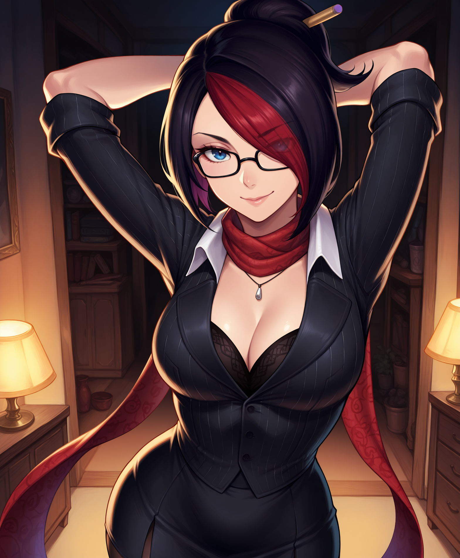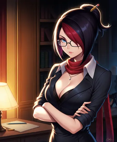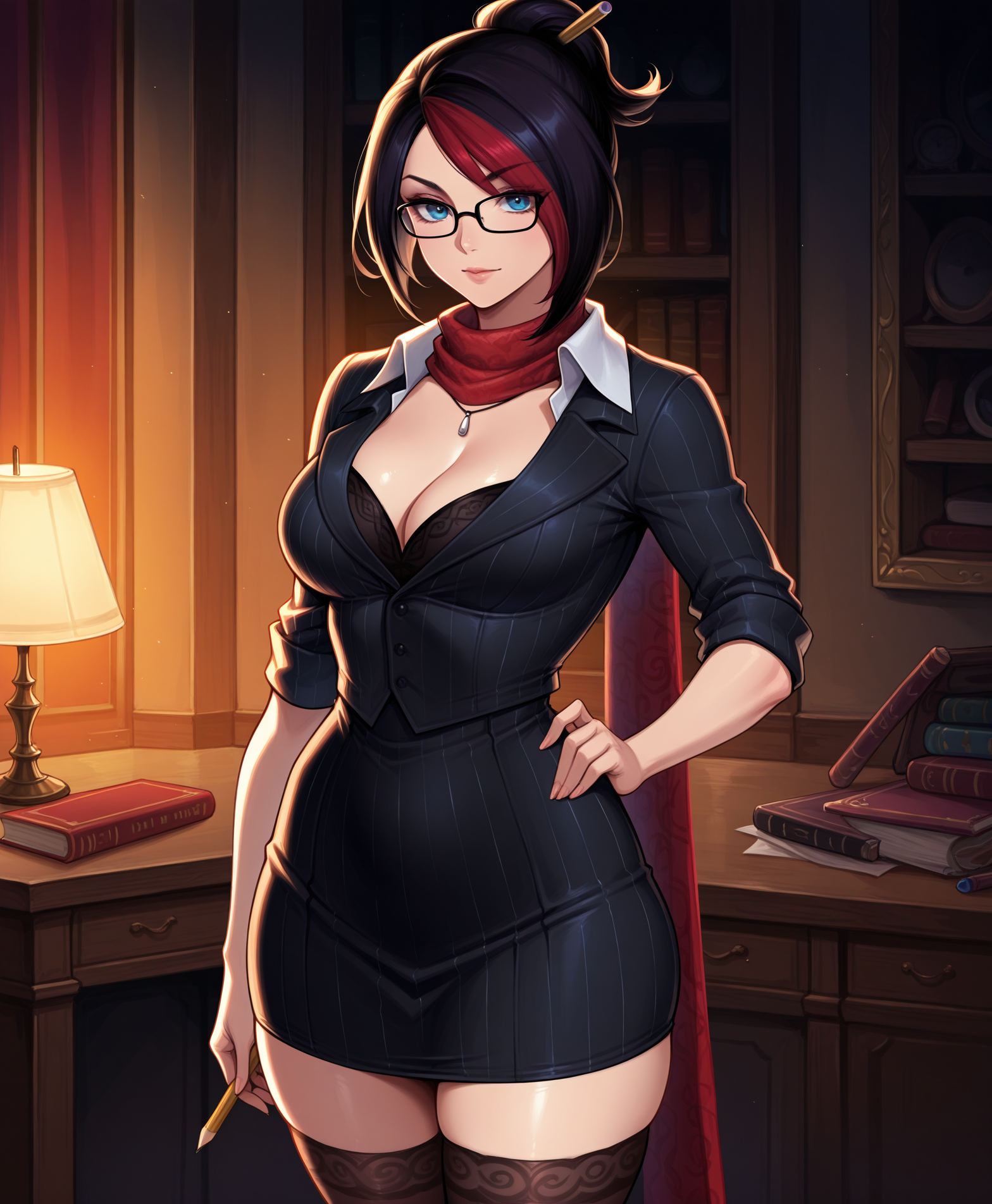 multicolored hair, short hair, pencil, glasses, blue eyes,