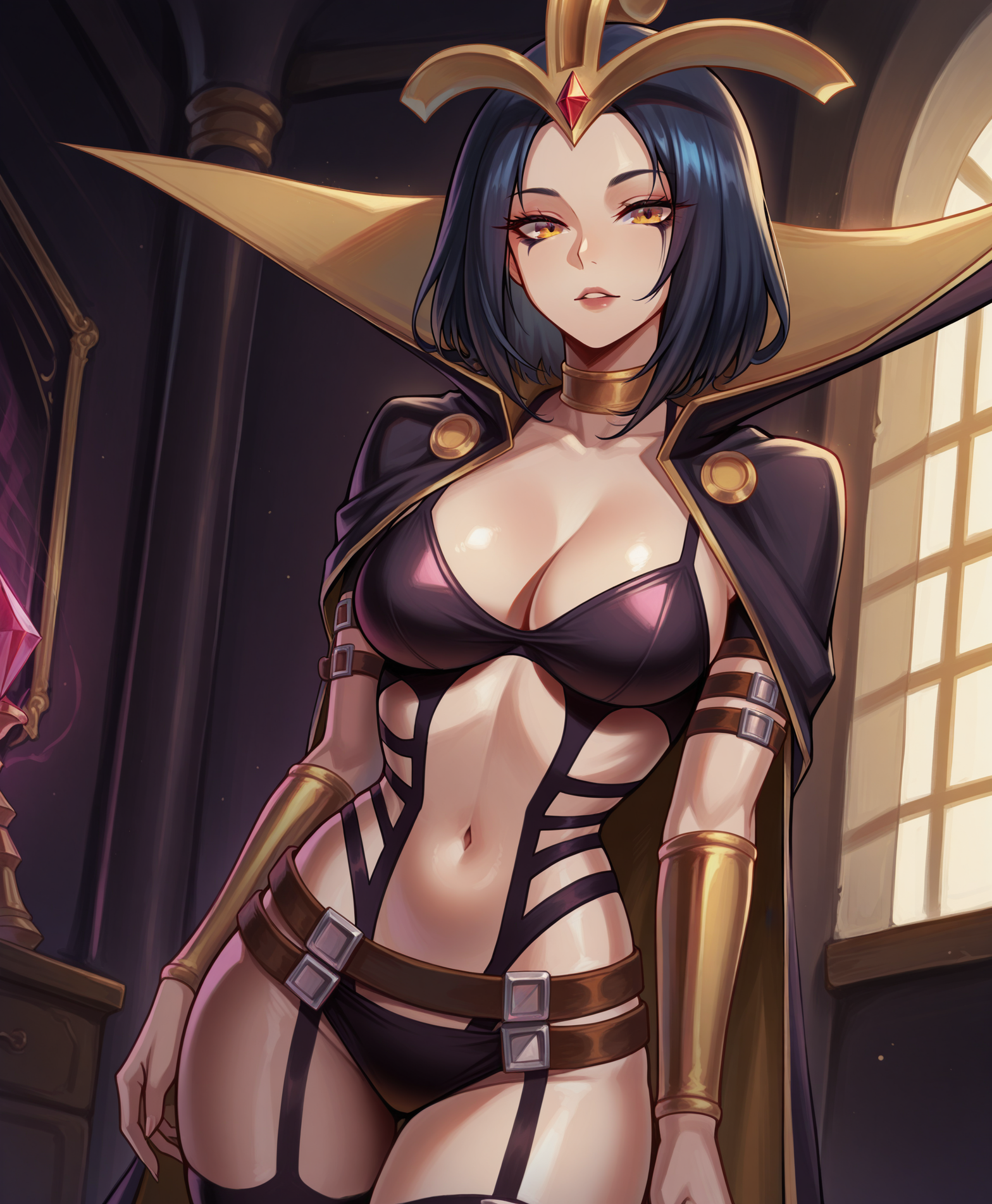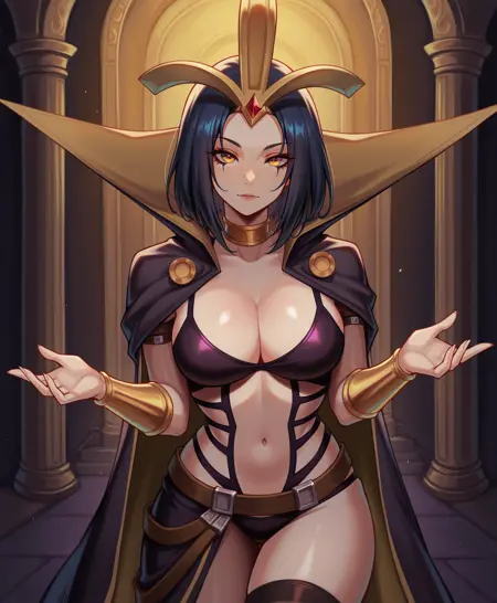 Use "bare shoulders" in prompt and put "cape" into the negative prompt to get her without her cloak.