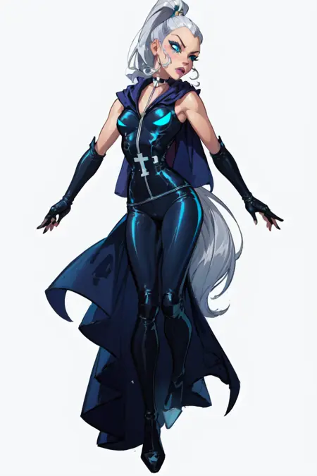 마녀 복장: WitchOutfit, 소매 없음, 진한 파란색 바디슈트, 무릎 부츠, 장갑, 겉옷