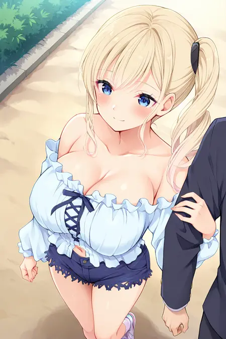 CasualOutfit、白いブラウス、オフショルダーブラウス、ロングスリーブ、フリル付きシャツ、リボン、カットオフ、肩出し、靴下、スニーカー、青いショートパンツ、短いショートパンツ、デニムショートパンツ、ベルト、足首出し、へそ出し