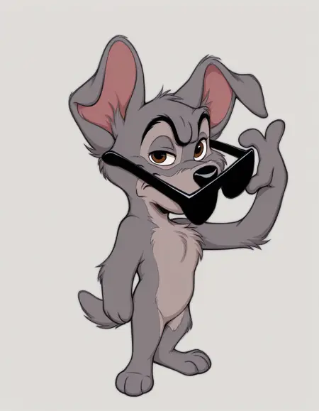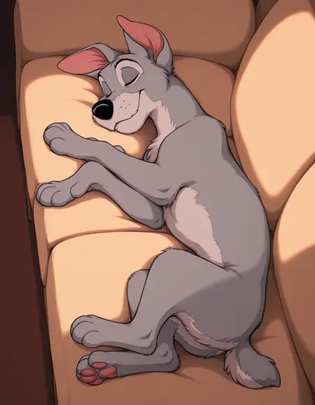 プロンプト: Tramp, gray fur, disney, male, brown eyes, black nose.