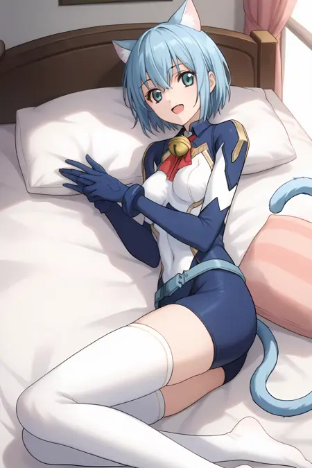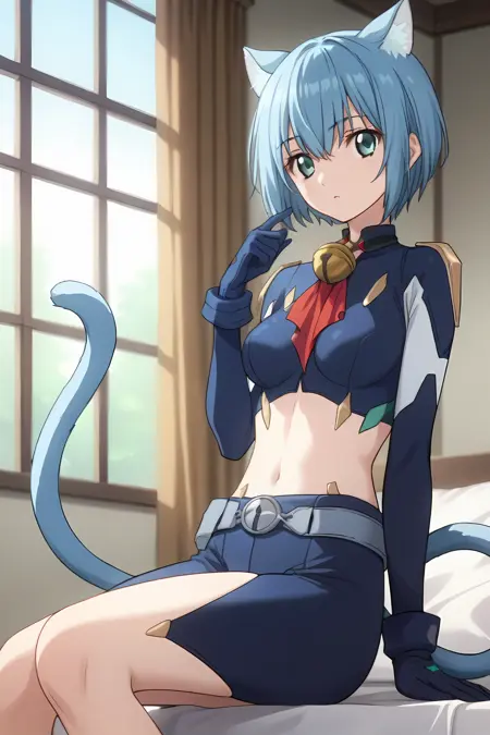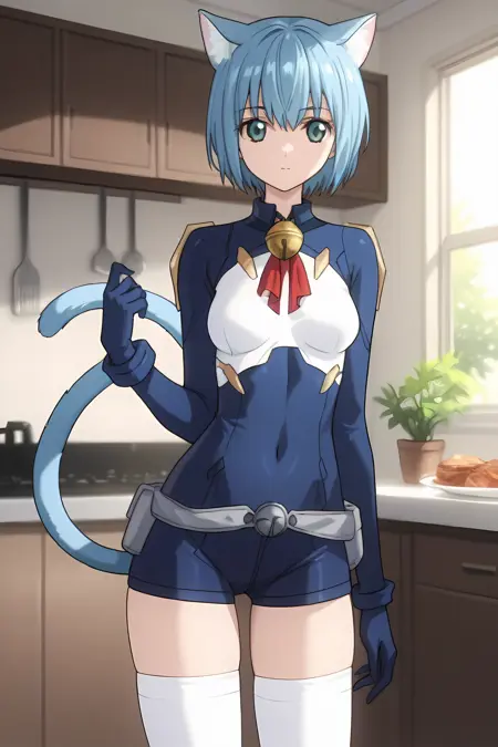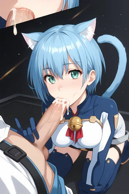 蓝色头发、短发、头发遮住眼睛、 Aqua 眼睛、猫耳、猫尾、颈铃、项圈