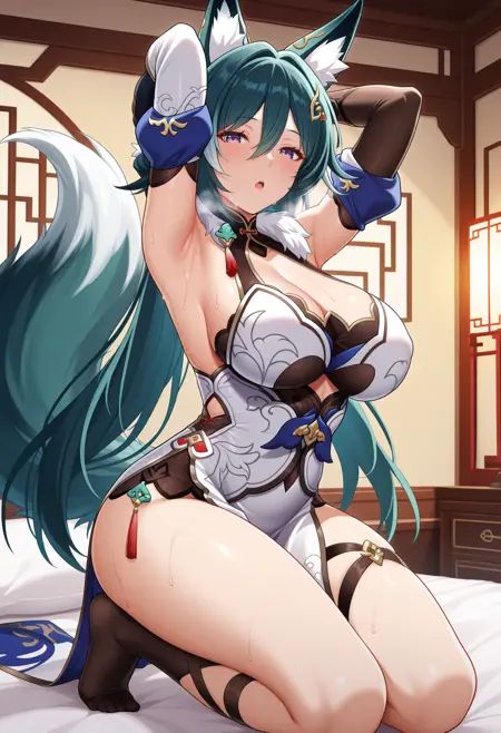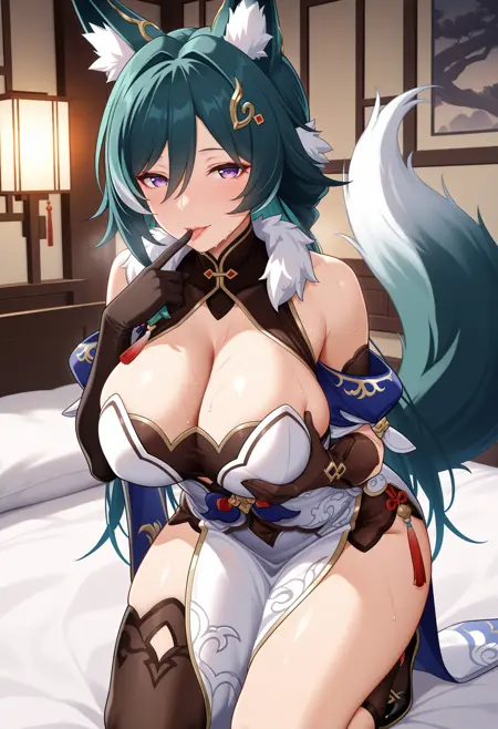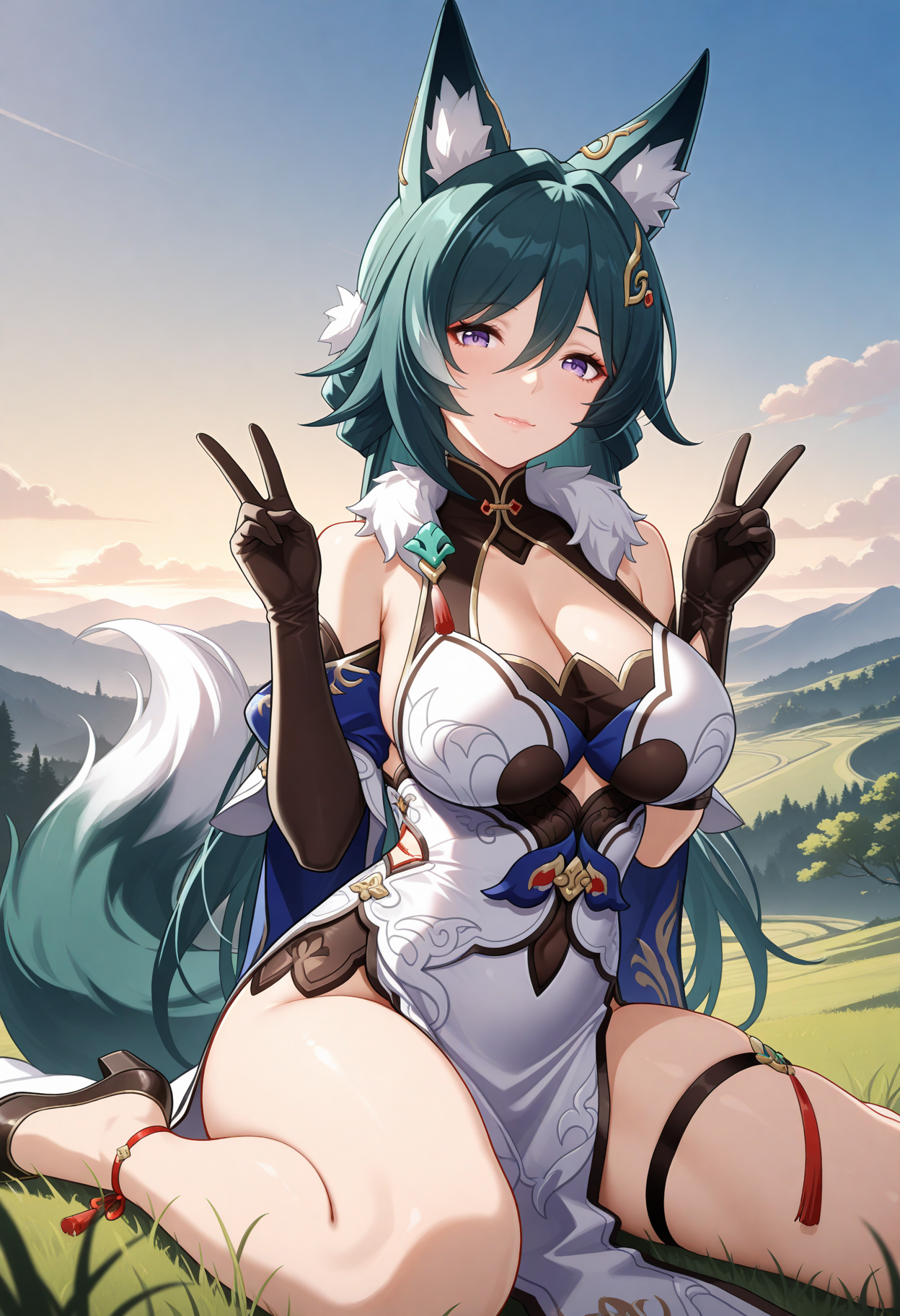 yukonghsr, purple eyes, green hair, streaked hair, long hair, fox girl, fox tail, china dress, clothing cutout, layered dress, pelvic curtain, black gloves, elbow gloves, detached sleeves, two-tone dress, uneven gloves, leg ribbon, thighs,