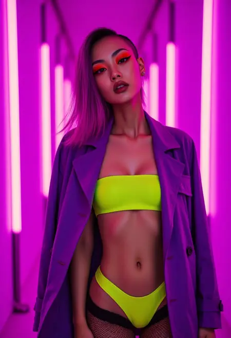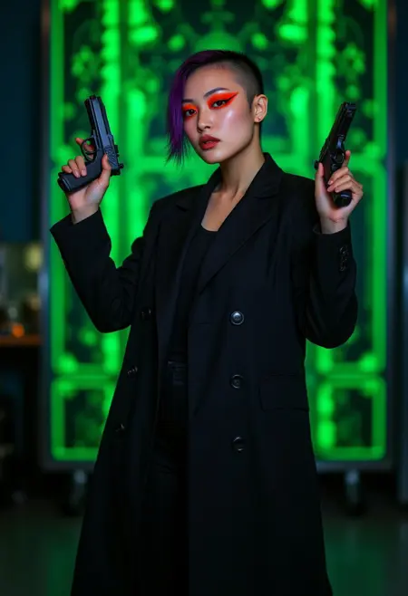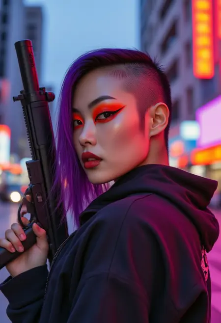 尝试了一个更具赛博朋克风格的女孩。FLUX 有时在处理 undercut 发型时会出现一些问题,但总体来说还不错。