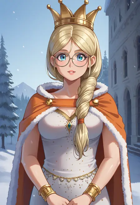 触发词:frysabel、眼镜、长发、金发女性、发辫、裙子、珠宝、手镯、王冠、斗篷