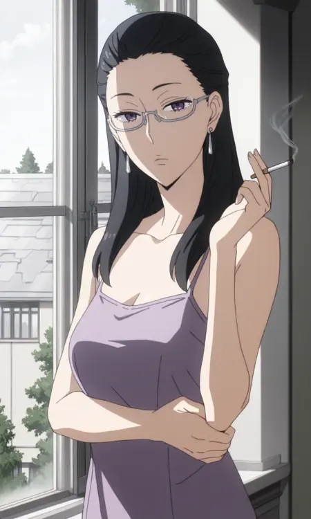 sharonmv, 1girl, solo, purple eyes, black hair, long hair, under-rim eyewear, silver earrings,