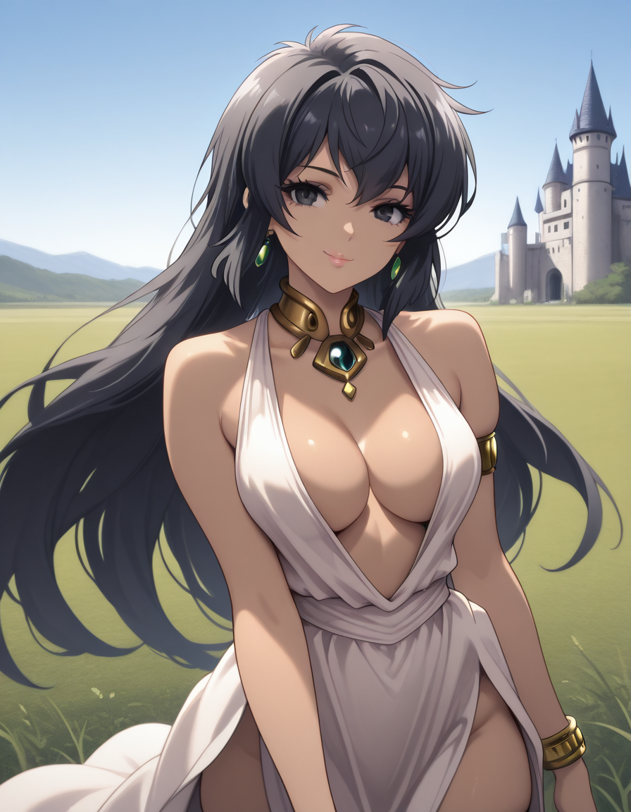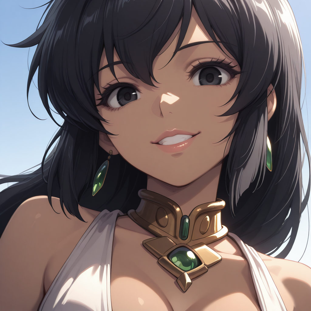 sheila, 1girl, black hair, black eyes, long eyelashes, very long hair, (pale skin:0.85), earrings, green jewelry, white dress, cleavage, medium breasts,