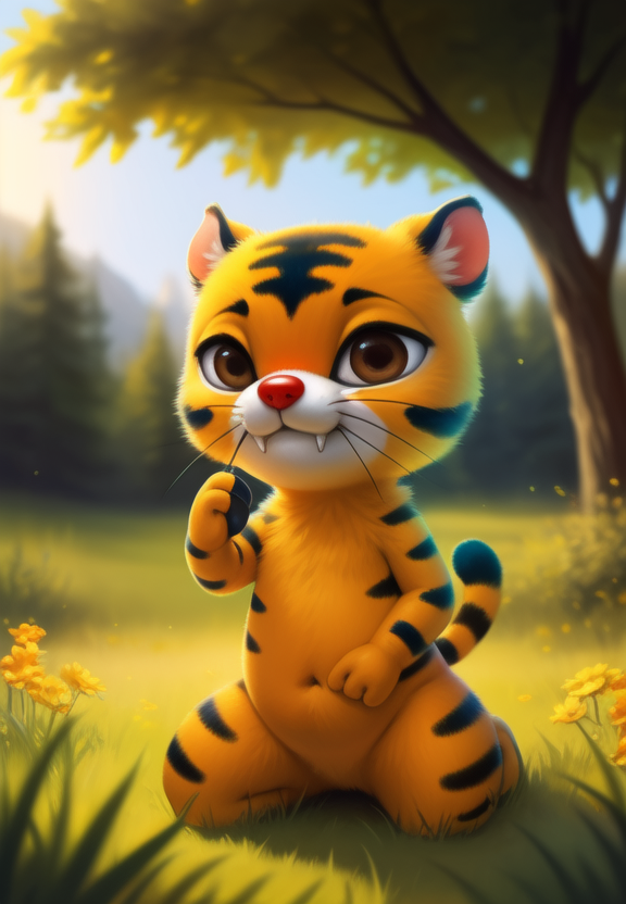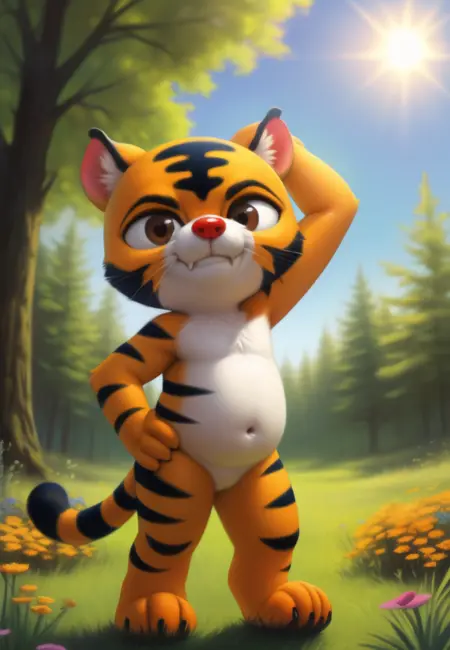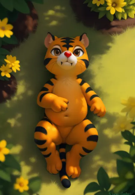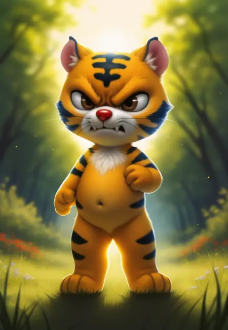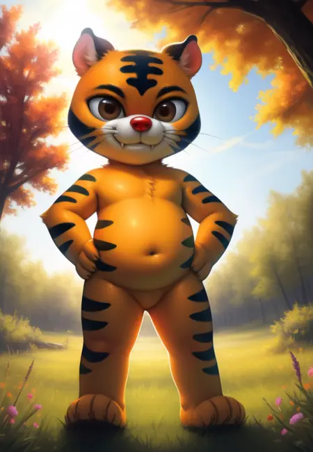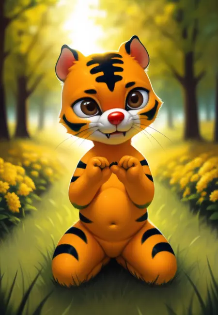 TigerCanStr, brown eyes, red nose, fangs, chibi, chubby, small body, big head, yellow belly,, nude, naced, chibi