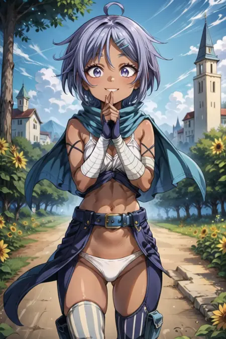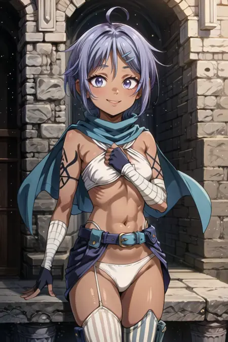 asymmetrical legwear, belt, blue scarf, , elbow gloves, , hair ornament, lowleg vertical stripes, vertical-striped thighhighs, white panties , dark-skinned female,
