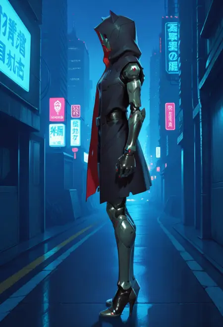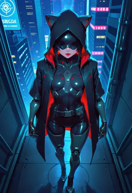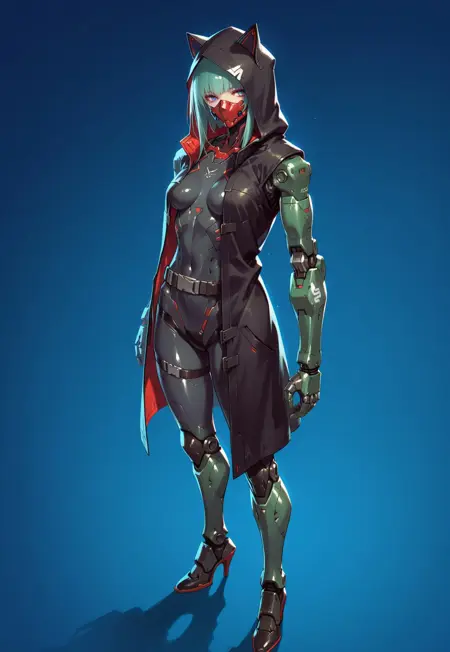 FelinaFo, 机械改造人, 面具, 连帽向上, 带帽斗篷, 机械臂, 腰带, 机械腿, 高跟鞋,