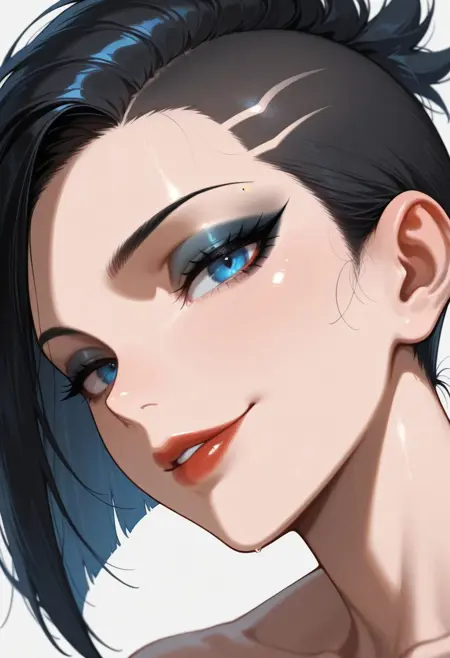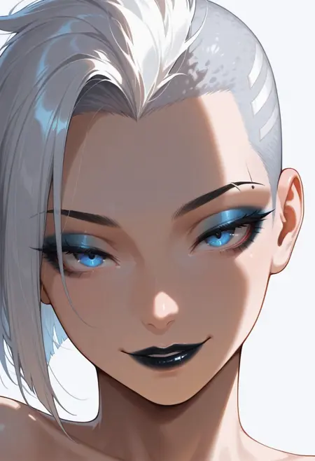 1girl, Selena-IL, mohawk hair, blue eyes, cybernetic body, sexy body, robot arms, robot thighs, robot legs,