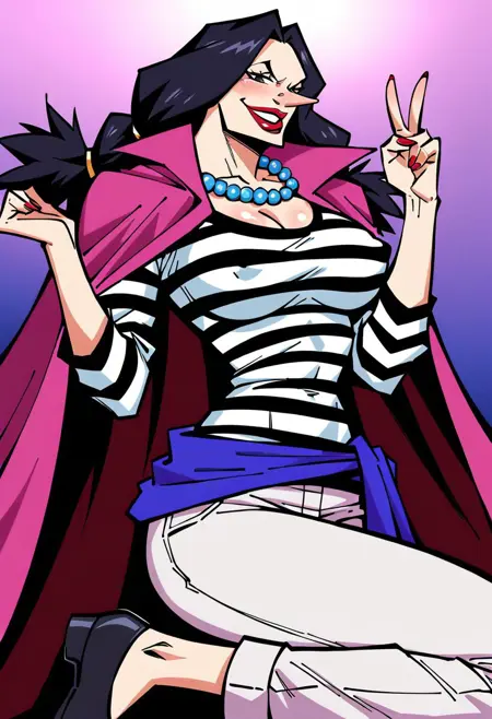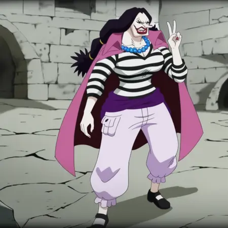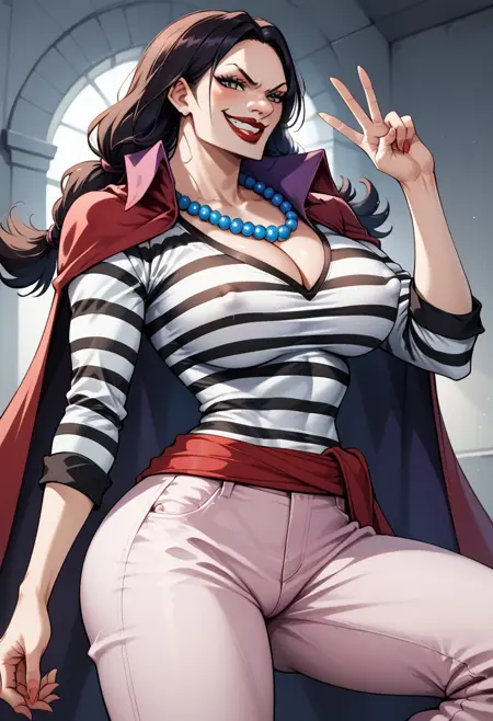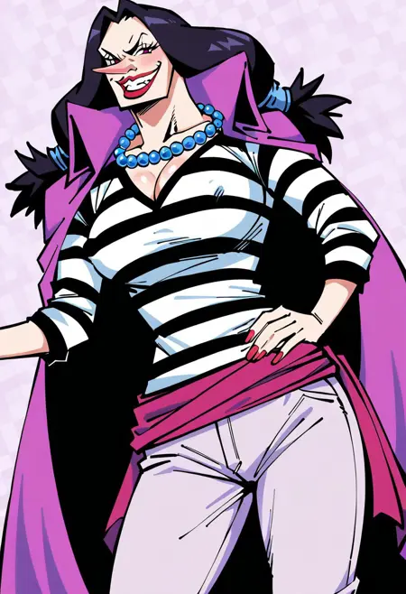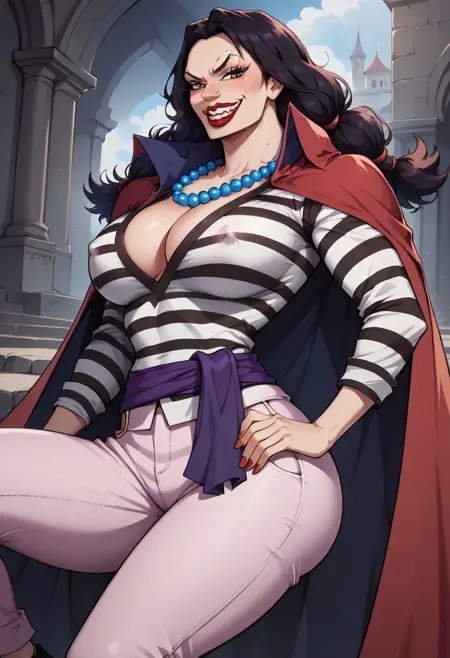 CatarinaDevonOP, 1소녀, 혼자, 검은 머리, 긴 머리, 키가 큰 여자, 창백한 피부의 여자, 두 줄기 땋은 머리, 주름, 검은 눈, 기울어진 이마, 긴 코, 사각턱, 악랄한 미소, 이빨, 입술, 붉은 립스틱, 메이크업, 큰 가슴, 넓은 엉덩이, 곡선이 아름다운 체형, 줄무늬 수감자 셔츠, V넥 셔츠, 가슴 라인, 보라색 망토, 고리가 있는 망토, 파란색 진주 목걸이, 허리에 두른 보라색 띠, 연분홍색 카고 팬츠, 검은 신발,