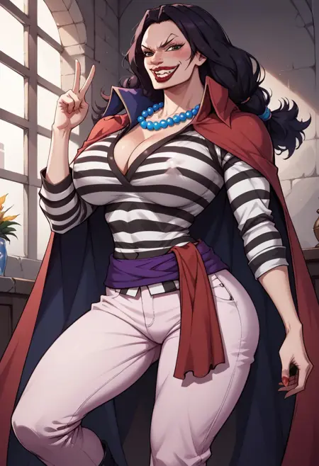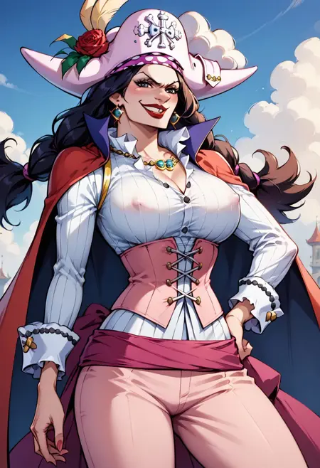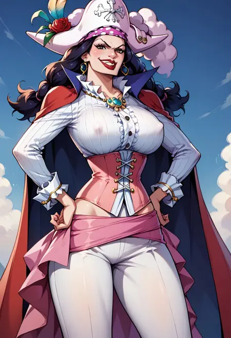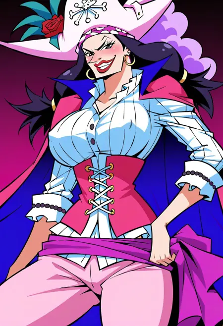 CatarinaDevonOP, 1소녀, 혼자, 검은 머리, 긴 머리, 키가 큰 여자, 창백한 피부의 여자, 두 줄기 땋은 머리, 주름, 검은 눈, 기울어진 이마, 긴 코, 사각턱, 악랄한 미소, 이빨, 입술, 붉은 립스틱, 메이크업, 큰 가슴, 넓은 엉덩이, 곡선이 아름다운 체형, 이중뿔 모자, 해적 모자, 모자에 핀 꽃, 모자에 달린 깃털, 모자에 달린 깃, 모자에 조디악 로저 무늬, 코르셋, 줄무늬 드레스 셔츠, 크라바트, 망토, 풍선바지, 벨트, 드레스 장식, 보석, 프릴, 귀걸이, 오른쪽 허리에 찬 검,