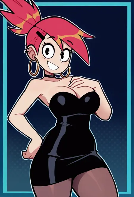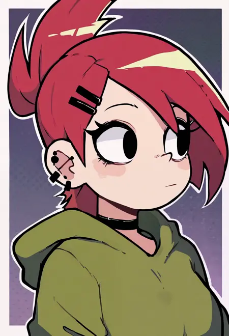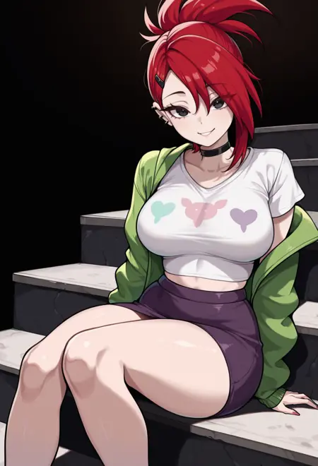 • Character Tags: red hair, hair ornament, ponytail, black eyes, hairclip, ear piercing, earrings, black choker