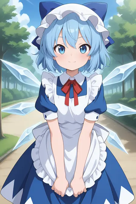cirno, 1girl, solo, blue eyes, blue hair, short hair, ice wings, ice, bow, hair bow, maid, apron, puffy sleeves, hat, mob cap, blue dress,