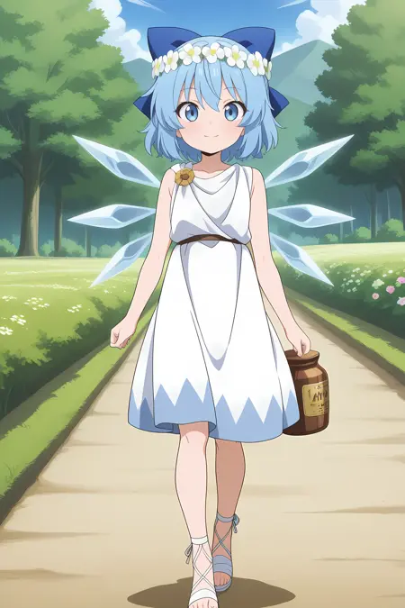 cirno, 1girl, solo, blue eyes, blue hair, short hair, ahoge, ice wings, detached wings, cirno \(white ice fairy of absolute zero\), alternate costume, hair flower, white flower, hair ornament, hair bow, blue bow, white dress, gold trim, himation, see-trough himation, ancient greek clothes, greco-roman clothes, gladiator sandals, white sandals, holding jar,
