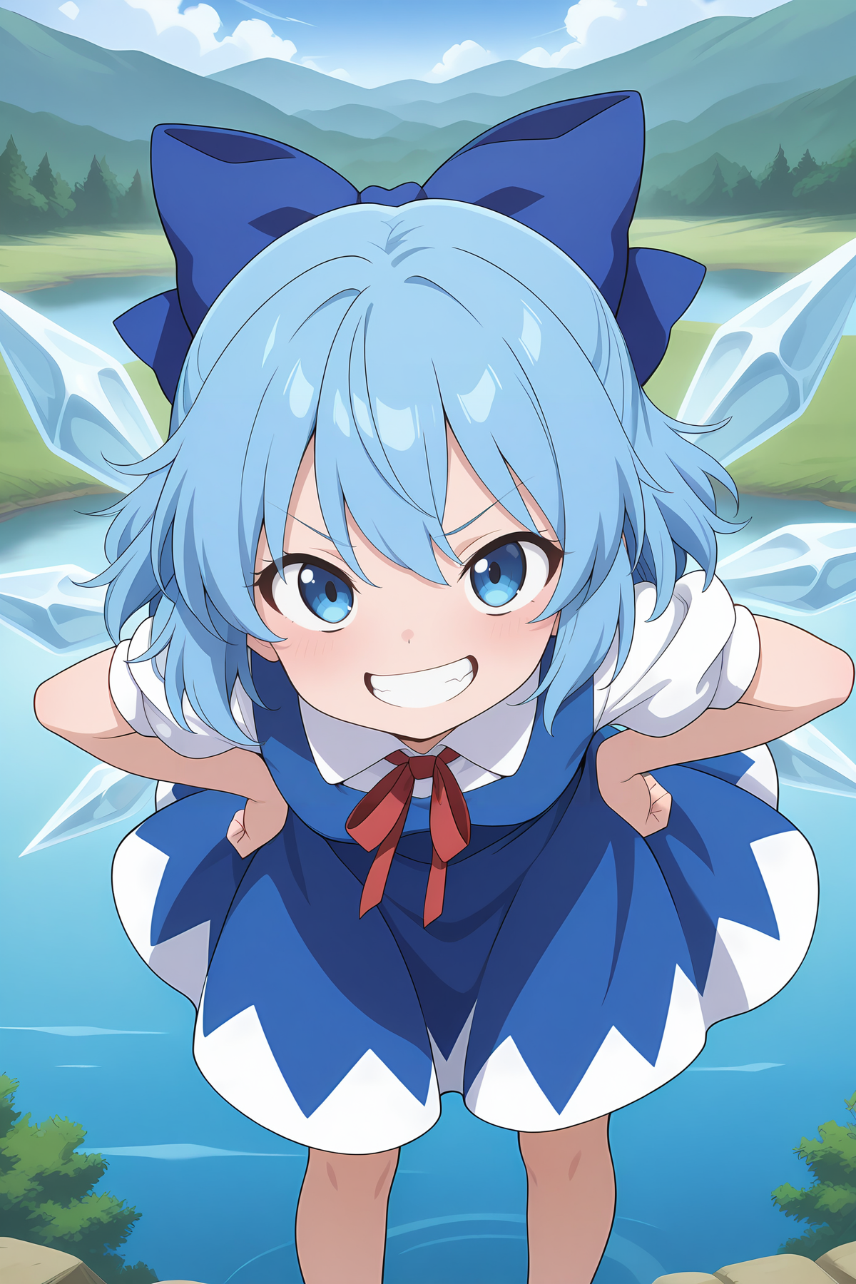 cirno, 1girl, solo, blue eyes, blue hair, short hair, ice wings, ice,