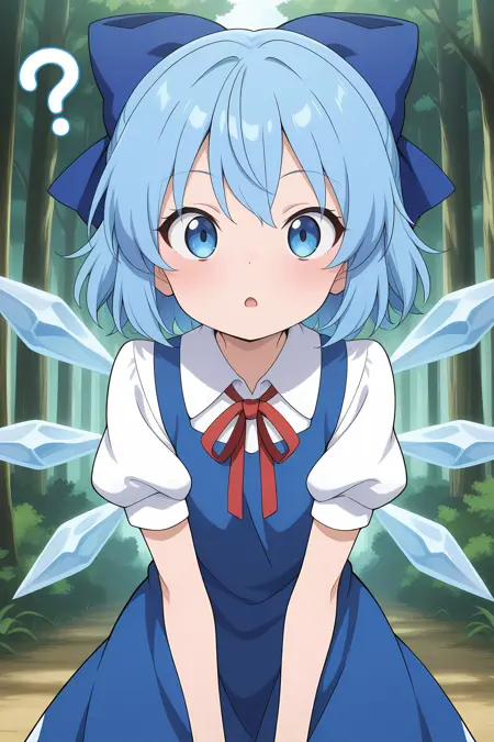 cirno, 1girl, solo, blue eyes, blue hair, short hair, ahoge, ice wings, detached wings,