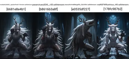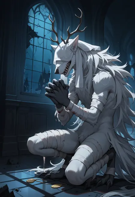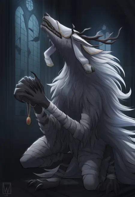 외모 태그: 뿔, 흰색 붕대, 붕대 감긴 팔, 붕대 감긴 다리, 발톱, Digitigrade, 몬스터, 날카로운 이빨, 강아지 이빨, 코, 눈 위 흰 베일, 가린 눈, 워울프, 흰 털, 흰 머리, 긴 머리