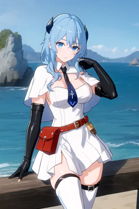 潮汐默认歌曲服装:波塞冬、潮汐之歌、白色连衣裙、长靴、黑色大腿袜、领带、大乳房、腰带、短披肩、小包,