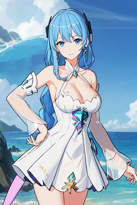潮汐默认歌曲服装:波塞冬、潮汐之歌、白色连衣裙、长靴、黑色大腿袜、领带、大乳房、腰带、短披肩、小包,