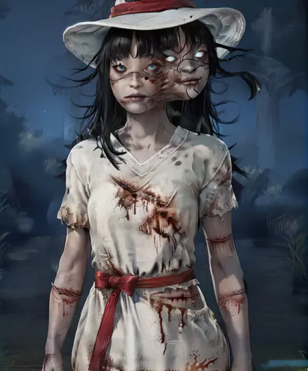 햇빛 모자, 흰 드레스, 빨간 리본, 옷에 피,
