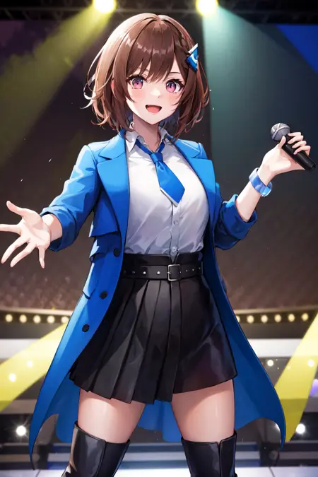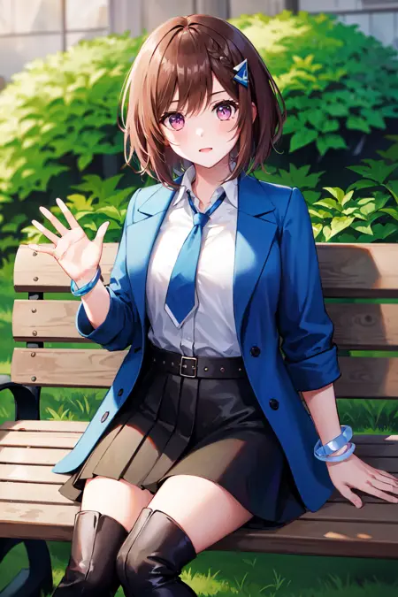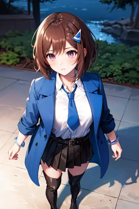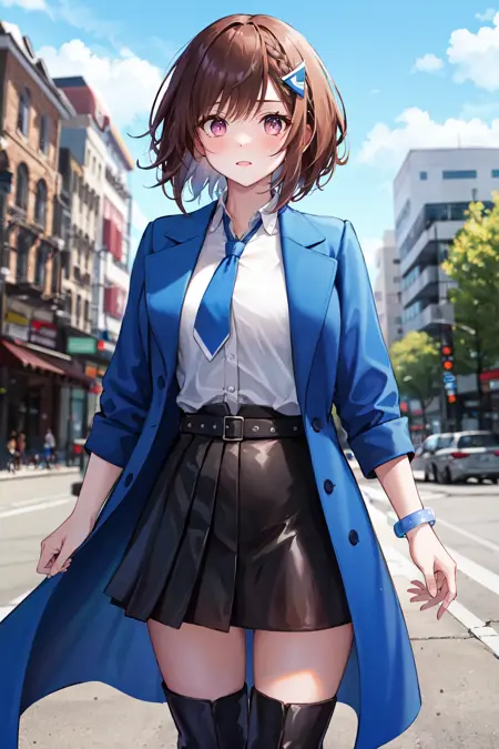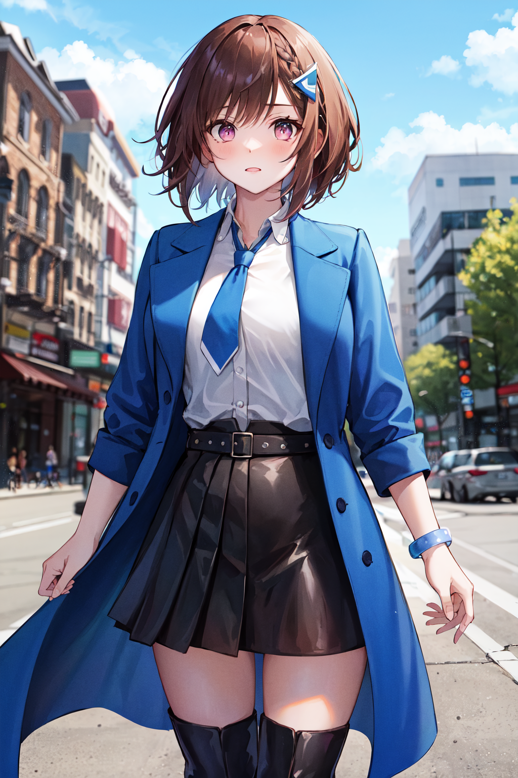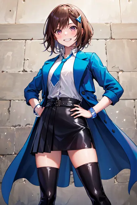 服装1aacocoa, 短发, 发饰, 蓝色领带, 有领衬衫, 白色衬衫, 衬衫塞进裤子里, 蓝色外套, 衣服敞开, 长袖, 手镯, 腰带, 黑色裙子, 百褶裙, 过膝靴