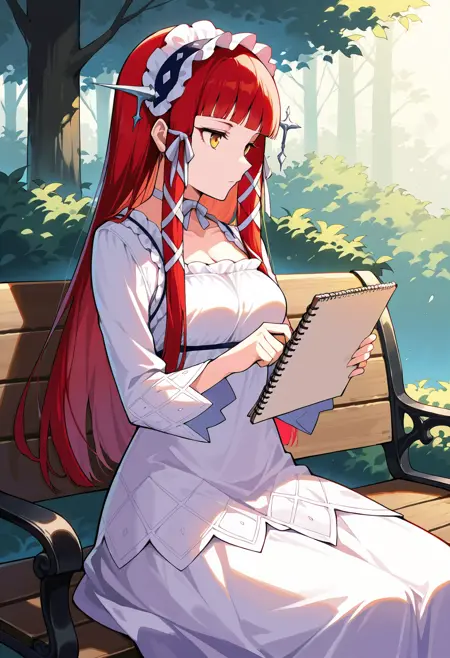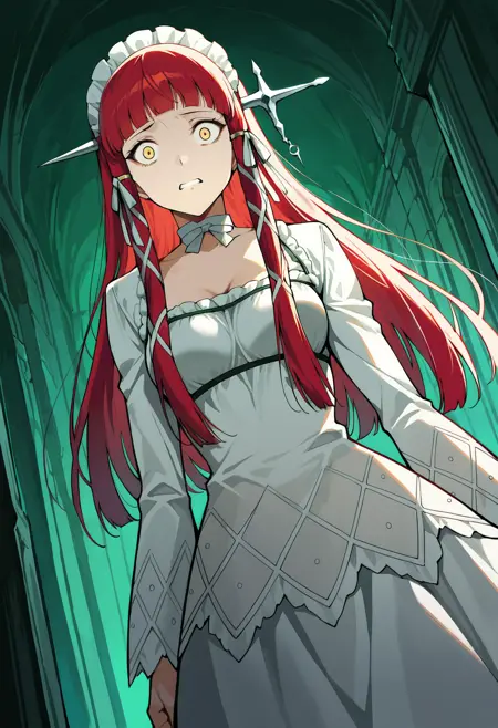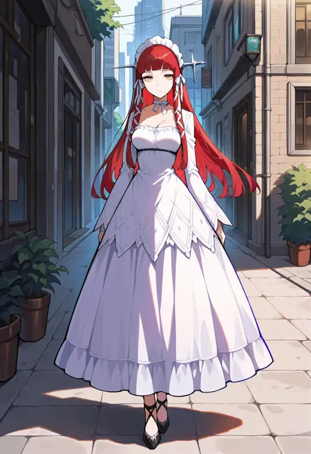 p3chidori, 노랑색 눈, 빨간 머리, 긴 머리, 곧은 앞머리, 두건, 머리 튜브, 머리 리본, 초커, 리본 초커, 드레스, 흰 드레스, 긴 소매 드레스, 긴 소매, frills,