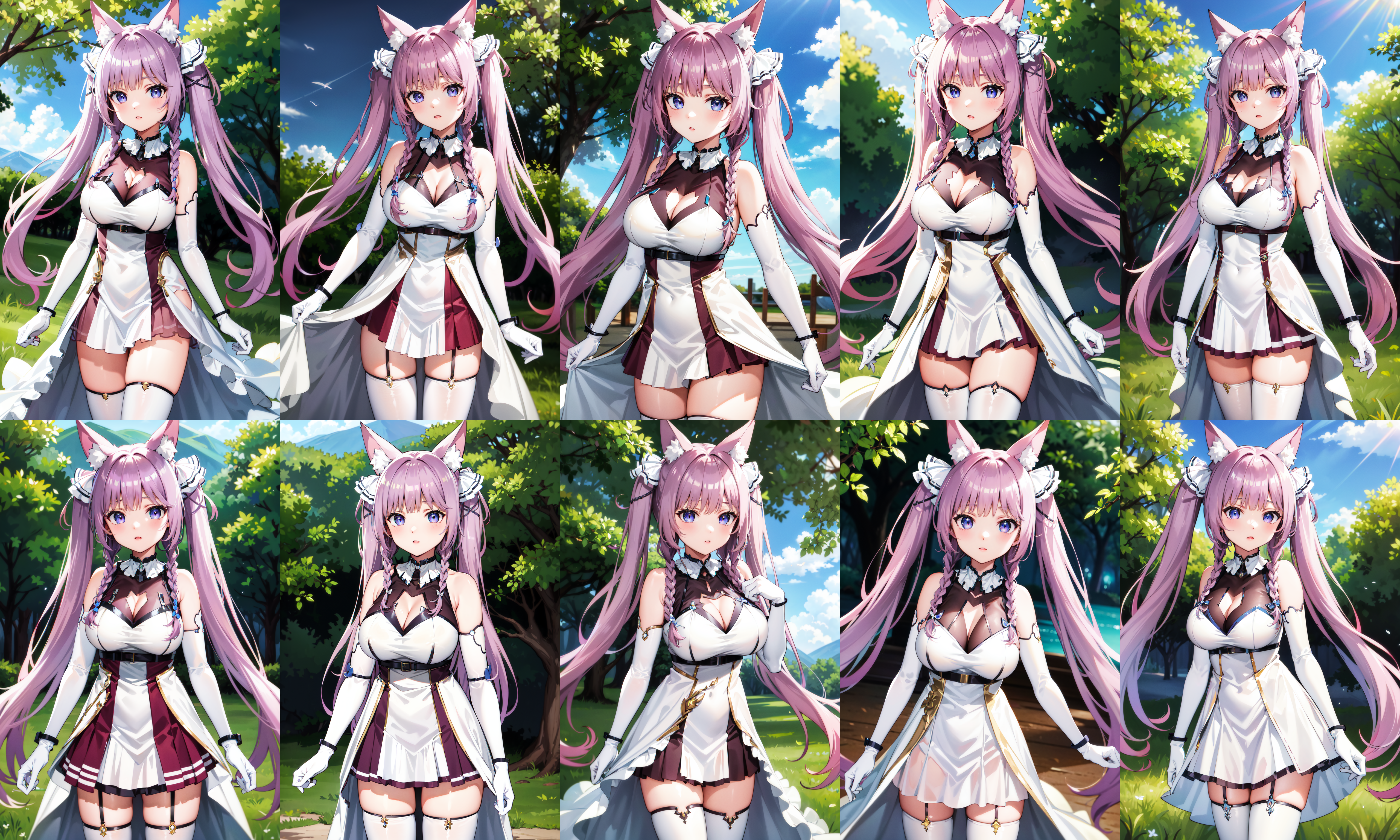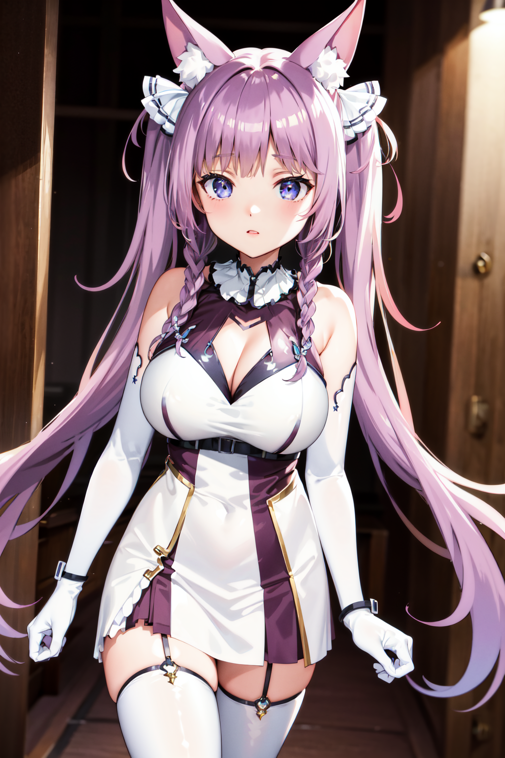 outfit1aatama, long hair, purple hair, animal ears, twintails, hair ribbon, white ribbon, twin braids, hair flower, purple eyes, breasts, see-through, cleavage cutout, white dress, elbow gloves, white gloves, purple skirt, garter straps, white thighhighs