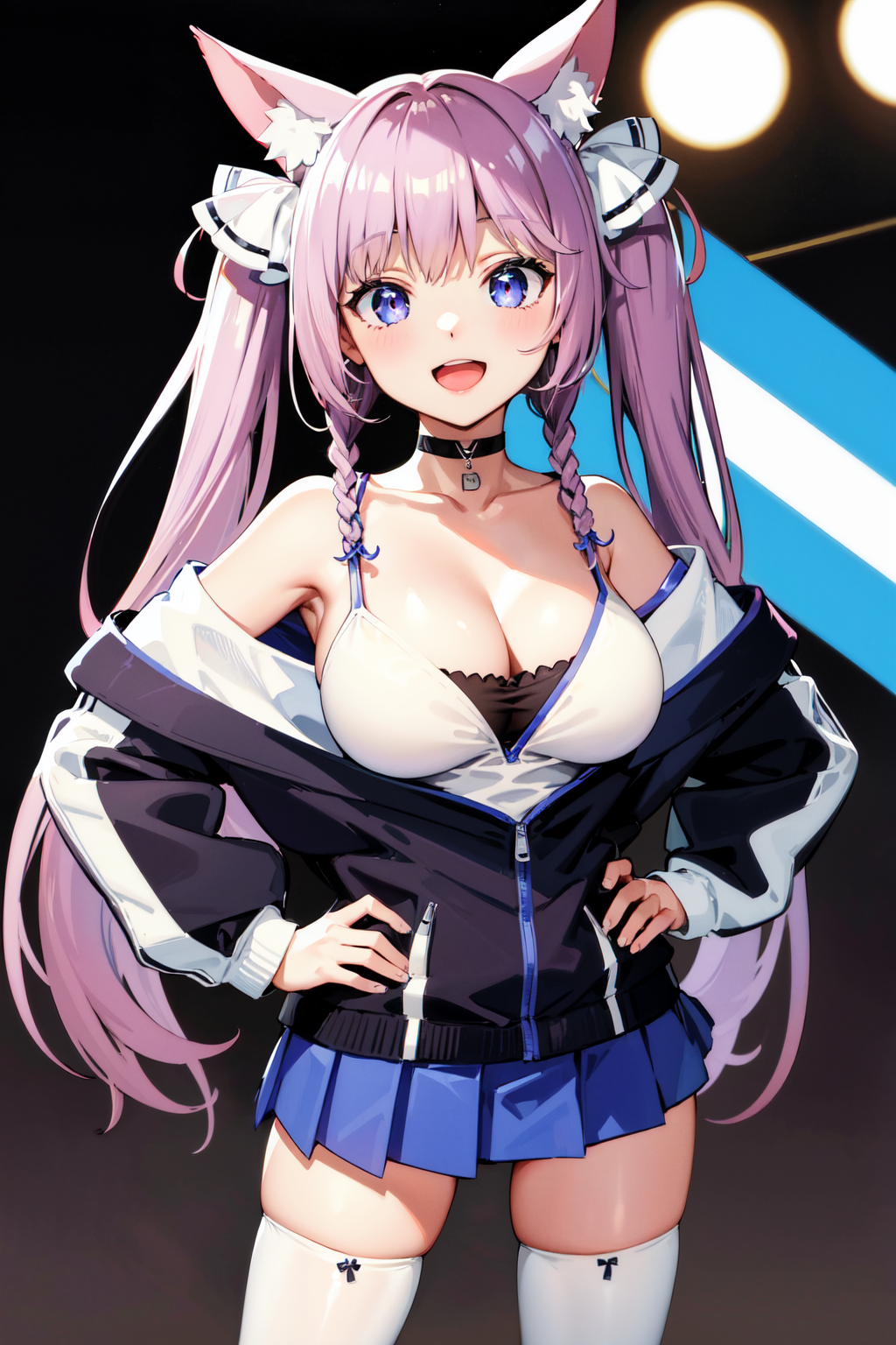 outfit3aatama, long hair, purple hair, animal ears, low twintails, hair bow, plaid bow, hood up, animal hood, purple eyes, breasts, tail, ribbon choker, crop top, white shirt, hooded jacket, white jacket, long sleeves, midriff, white bloomers, thigh strap