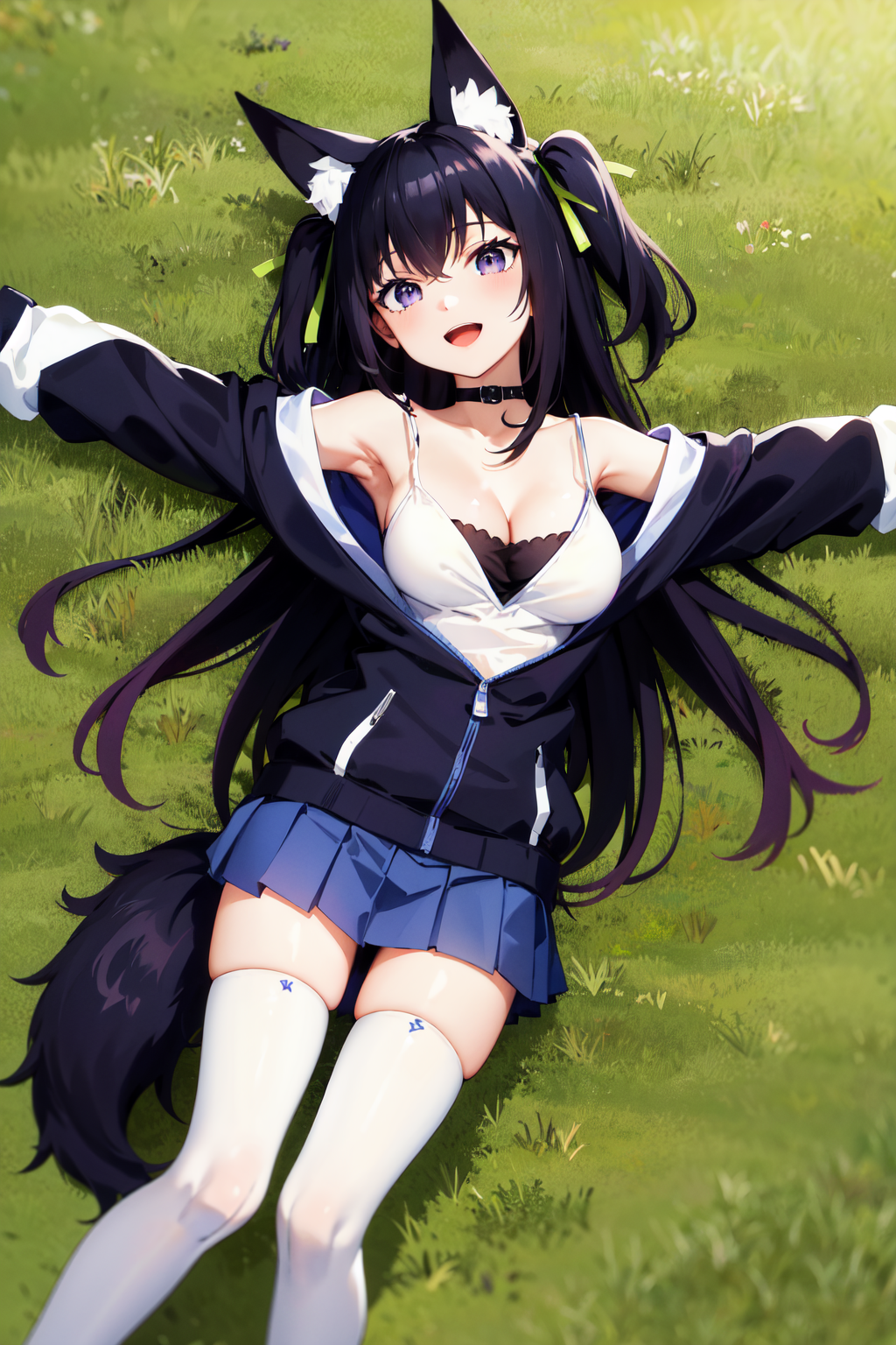 outfit4bbtama, long hair, black hair, animal ears, two side up, hair ribbon, green ribbon, purple eyes, breasts, tail, black choker, cleavage, off shoulder, black jacket, long sleeves, pleated skirt, blue skirt, white thighhighs