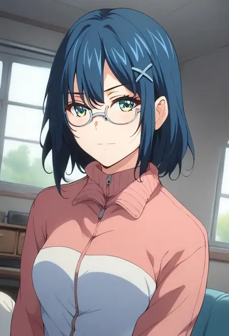 佐藤直: 1girl,naos,green eyes,blue hair,hair ornament,hairclip,x hair ornament,glasses,track jacket,track suit