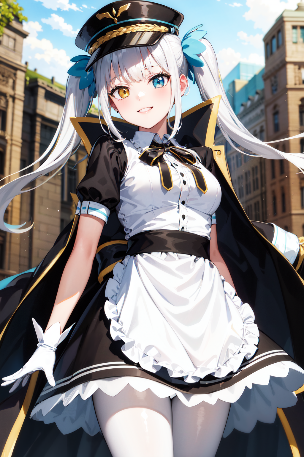 服装2(有外套)hmmea, 双马尾, 头发丝带, 蓝色丝带, 异色瞳, 帽子, 尖顶帽, 花边, 颈部丝带, 黑色丝带, 中等胸部, 黑色连衣裙, 蓬松短袖, 黑色袖子, 白色手套, 白色围裙, 白色连裤袜, 黑色外套, 袍子搭在肩上
