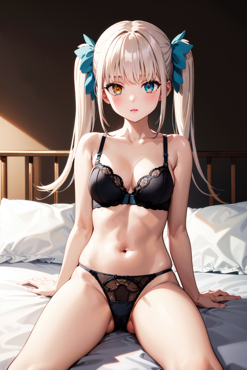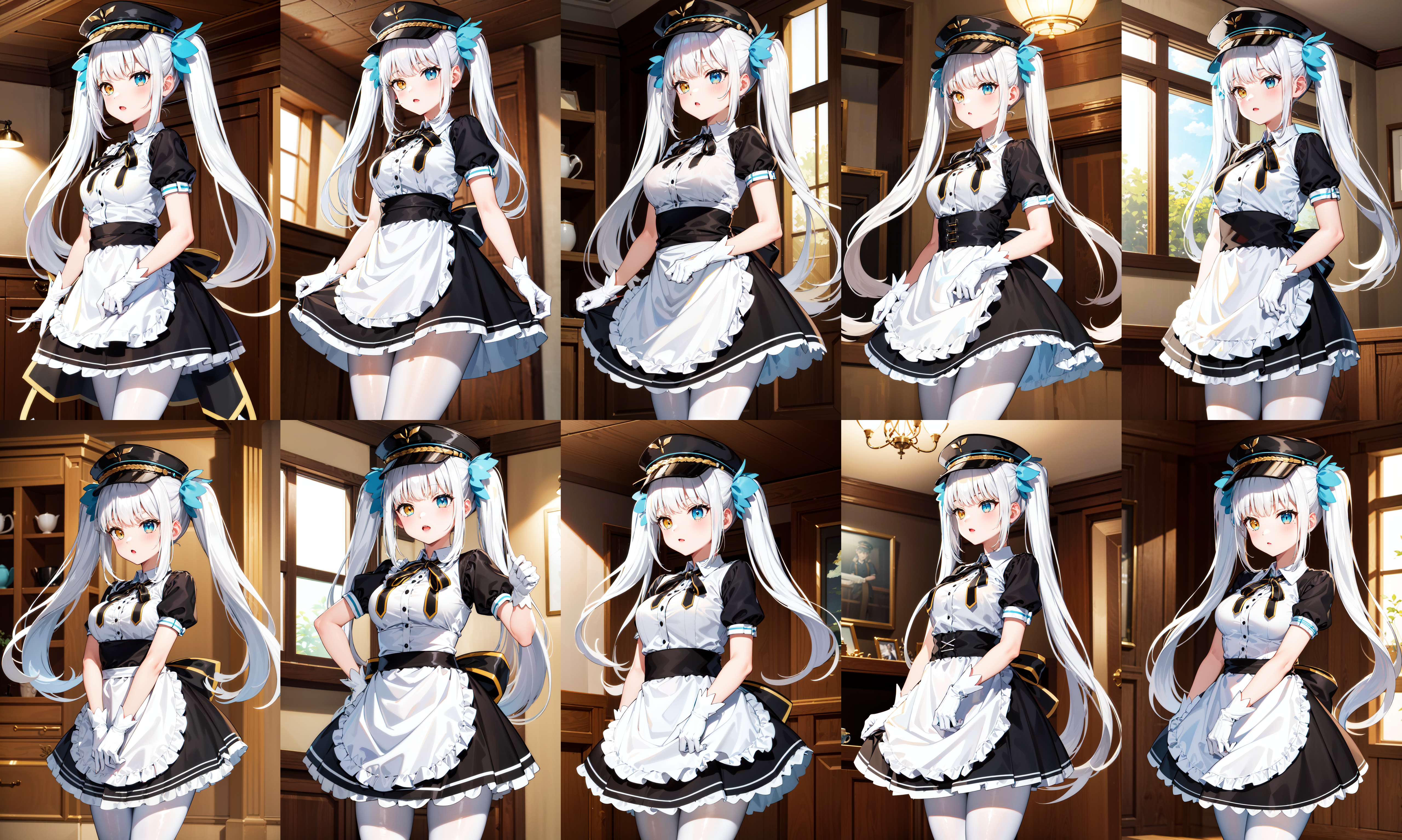 服装1(无外套)hmmea, 双马尾, 头发丝带, 蓝色丝带, 异色瞳, 帽子, 尖顶帽, 花边, 颈部丝带, 黑色丝带, 中等胸部, 黑色连衣裙, 蓬松短袖, 黑色袖子, 白色手套, 白色围裙, 白色连裤袜