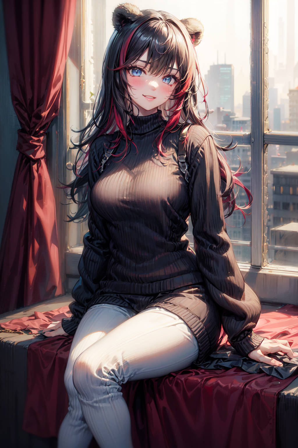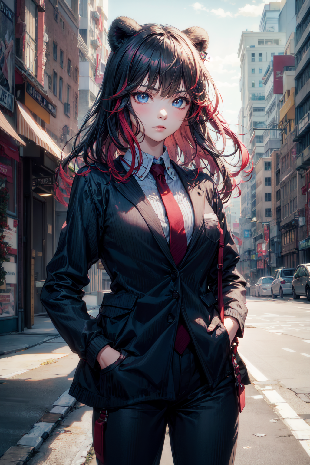 外見プロンプト:zima, 1girl, solo, long hair, black hair, red hair, multicolored hair, blue eyes, bear ears,