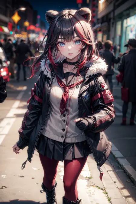 プロンプト:zima, 1girl, solo, long hair, black hair, red hair, multicolored hair, blue eyes, black jacket, fur-trimmed jacket, skirt, choker, school uniform, neckerchief, standing, open jacket, bear ears, animal ears, pantyhose, boots