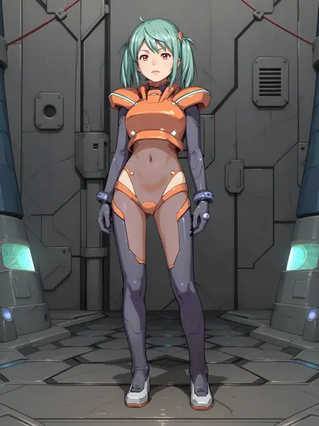 Add-Ons: 1girl, solo, short twintails, teal hair, orange armor, grey plugsuit, gloves, boots